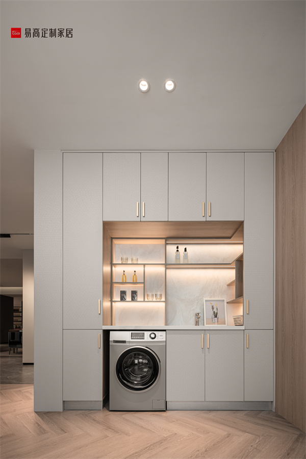 作為室內空間的鏈接紐帶,陽臺采用滿墻收納柜設計,注重功能整合,打造理性有序的空間節奏。玻璃格柵引光入景,被陽光親吻過的家,浪漫且富足。生活之美,不言而喻。